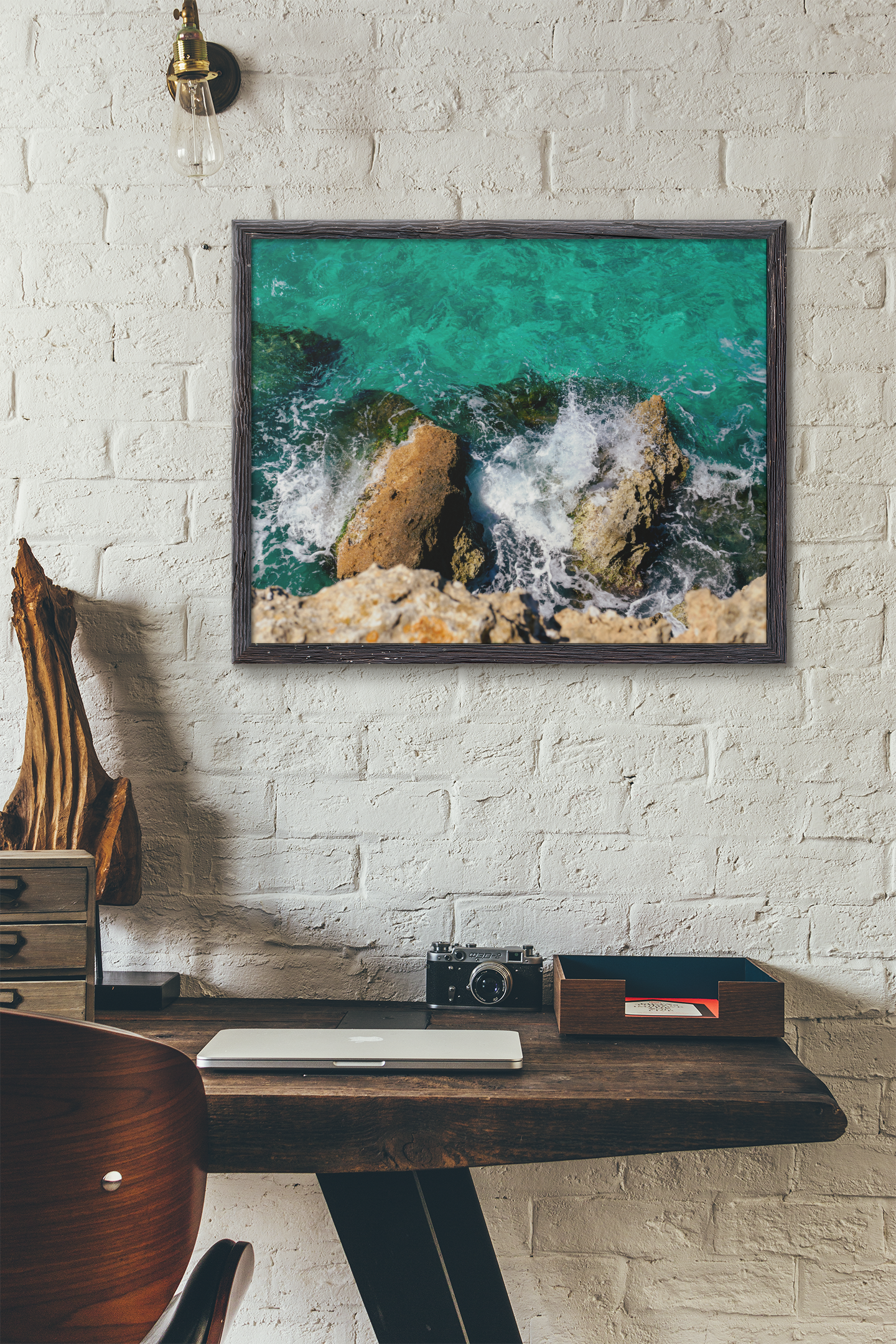 Taken during a sunny afternoon at the coastline of Mallorca, at the edge of the cliffs. Close-up view of turquoise waves crashing against rugged, moss-covered rocks, creating white frothy splashes. The vibrant water contrasts sharply with the rocky edges in the foreground.